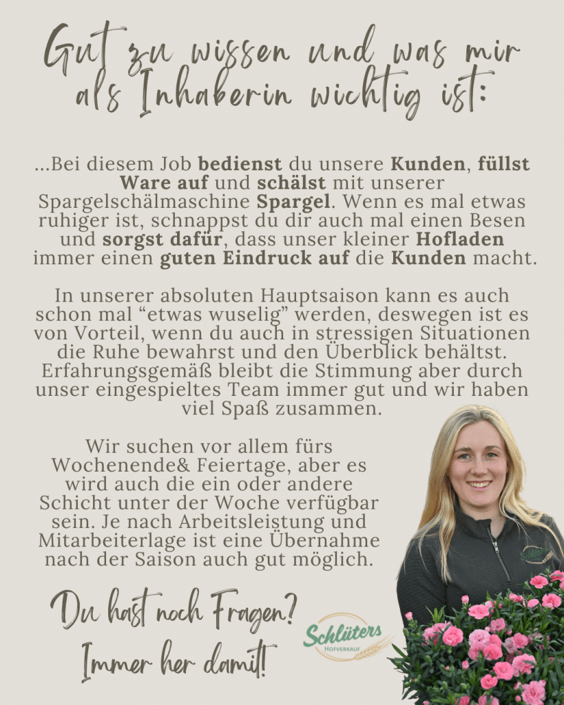 Für die Lintorfer Spargelsaison 2026 suchen wir noch tatkräftige Unterstützung im Verkauf. Alle Infos findest du auf den Fotos. Wenn du Interesse hast, aber noch Fragen hast, melde dich sehr gerne per Mail/ Instagram oder WhatsApp. Ich freue mich auf deine Nachricht. Liebe Grüße, Farina