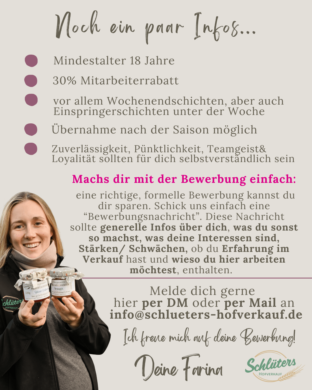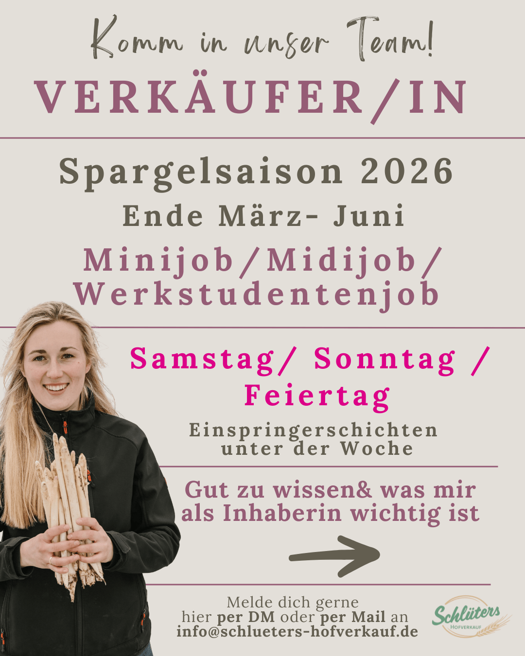 Für die Lintorfer Spargelsaison 2026 suchen wir noch tatkräftige Unterstützung im Verkauf. Alle Infos findest du auf den Fotos. Wenn du Interesse hast, aber noch Fragen hast, melde dich sehr gerne per Mail/ Instagram oder WhatsApp. Ich freue mich auf deine Nachricht. Liebe Grüße, Farina