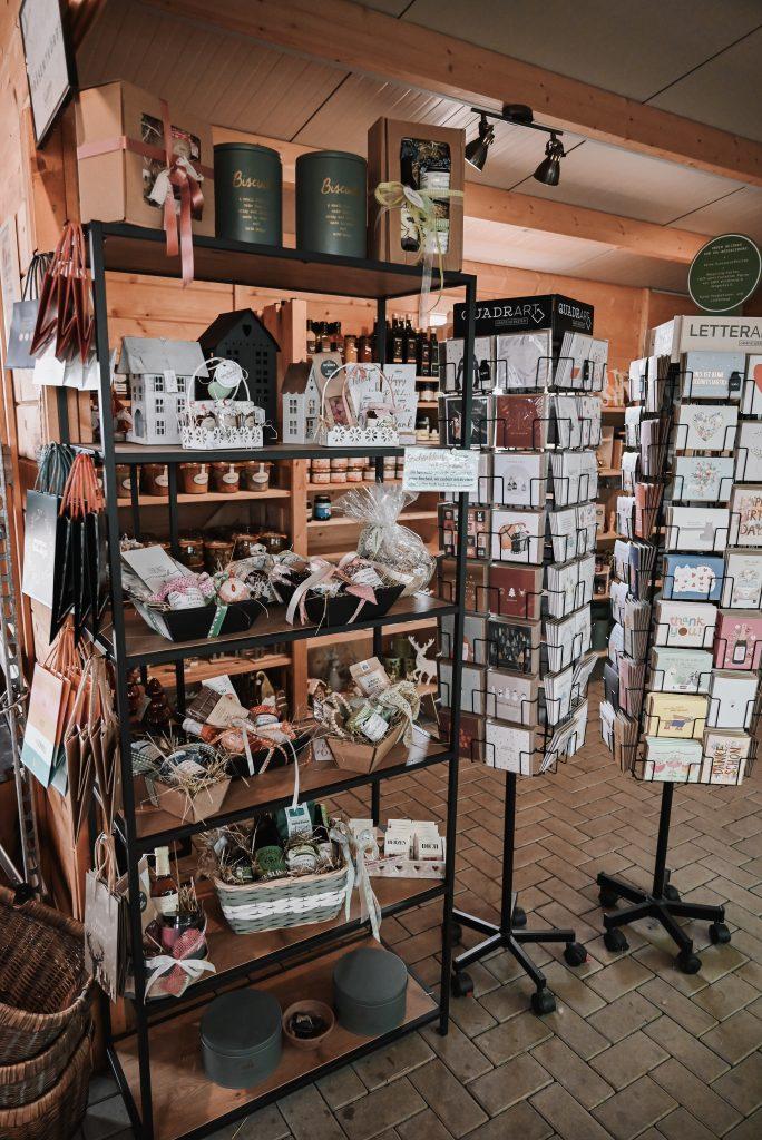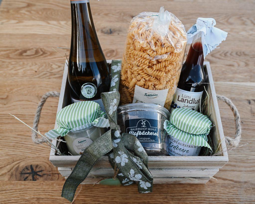 Direkt vorne links im Hofladen findet ihr Schlüters Präsentkorbecke. Hier findet ihr immer eine vielfältige Auswahl an fertigen Körben direkt zum Mitnehmen.